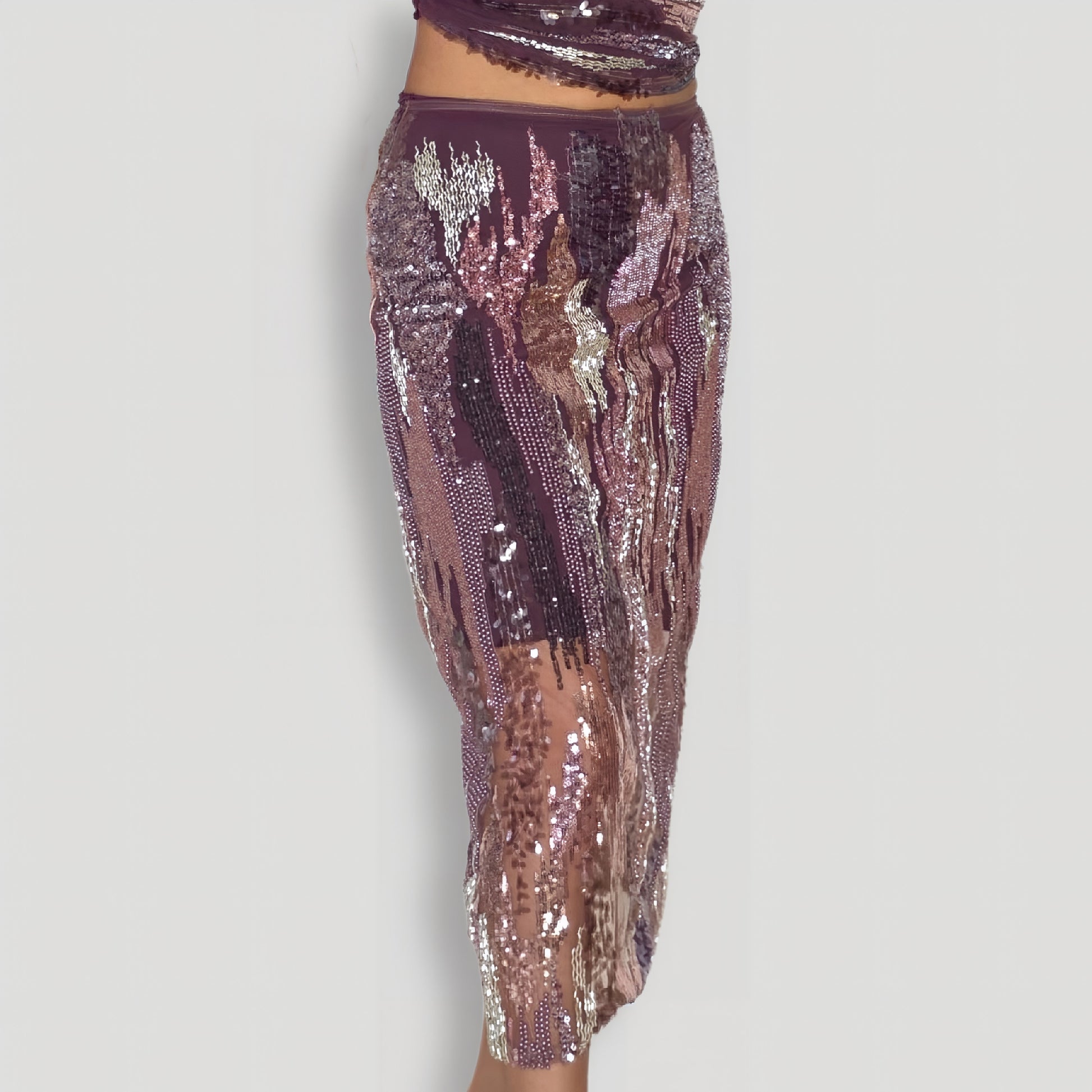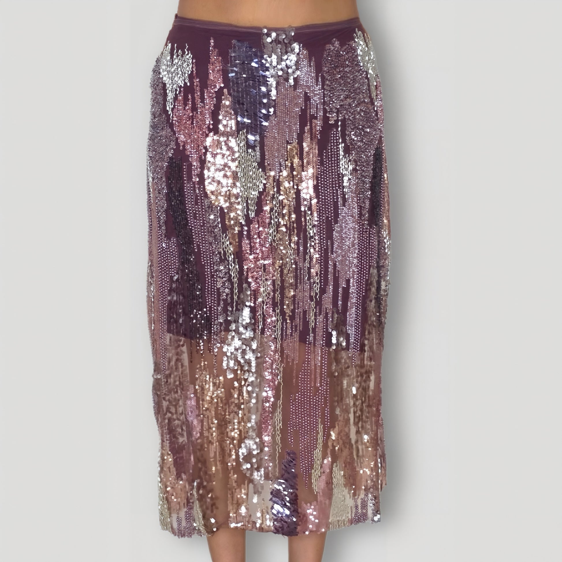 חצאית מידי ייחודית בגוון בורדו עמוק, מעוטרת בפסי פאייטים נוצצים בגווני זהב, ורוד ושמפניה המשתלבים יחד למראה אומנותי וזורם. העיצוב השקוף והמתנפנף יוצר תחושת תנועה וחושניות, תוך שמירה על קלאסה יוקרתית שמתאימה לאירועי ערב ולמסיבות ייחודיות.
