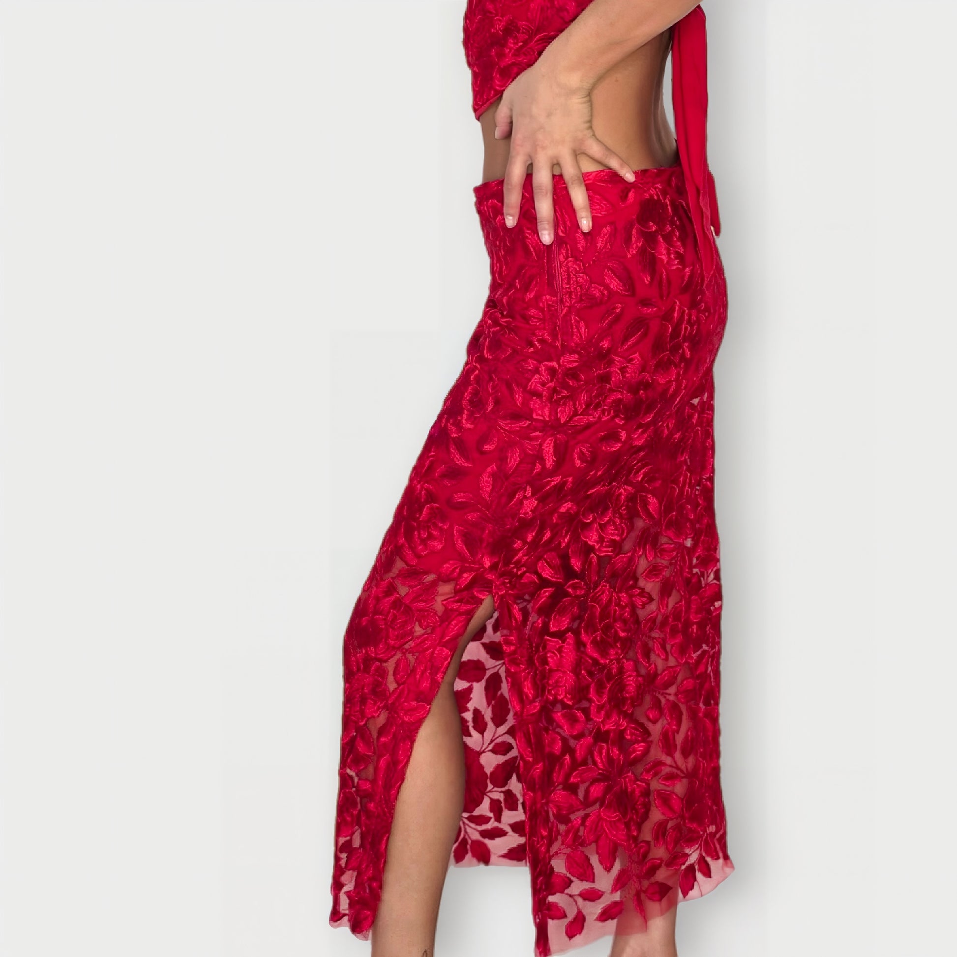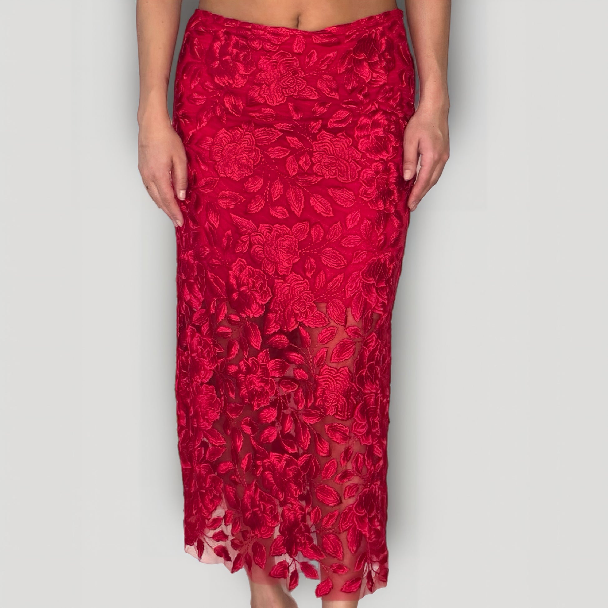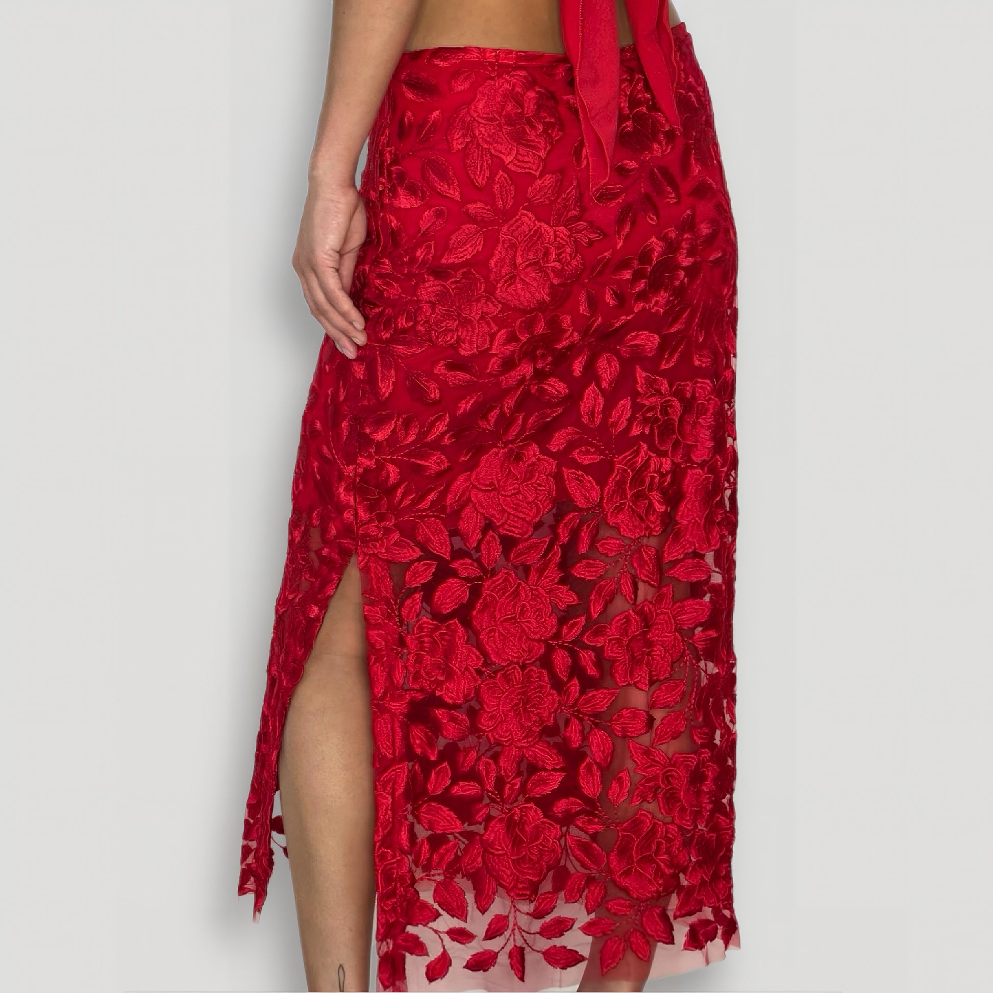 חצאית מידי בגוון אדום עז, בעיצוב תחרה פרחונית עשירה עם שקיפות עדינה בתחתית. הדוגמה הפרחונית המובלטת יוצרת מראה דרמטי ונשי, והגזרה האלגנטית מחמיאה לגוף תוך שמירה על קלאסה יוקרתית. אידיאלית לאירועים מיוחדים, חגיגות או לוק ערב מרשים במיוחד.