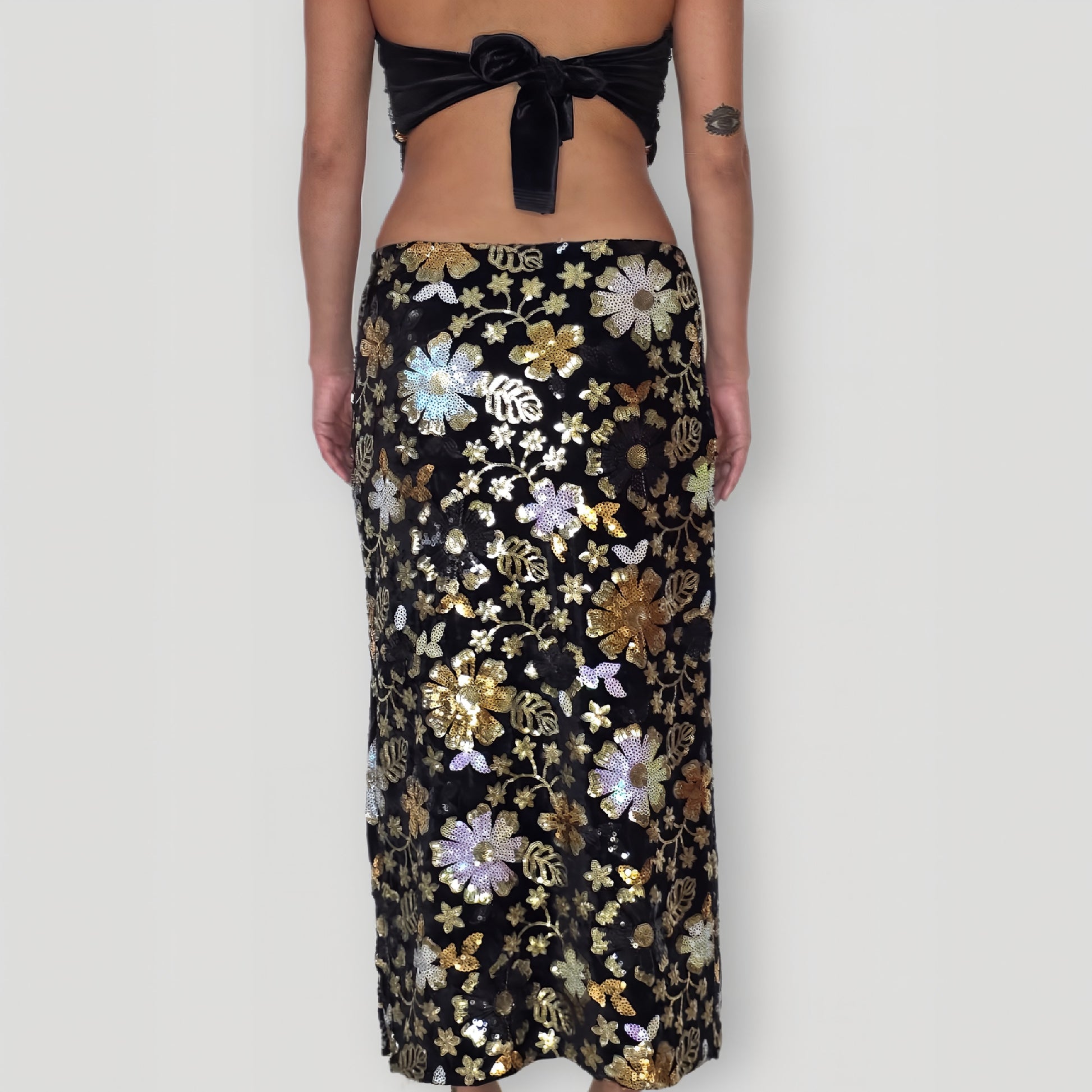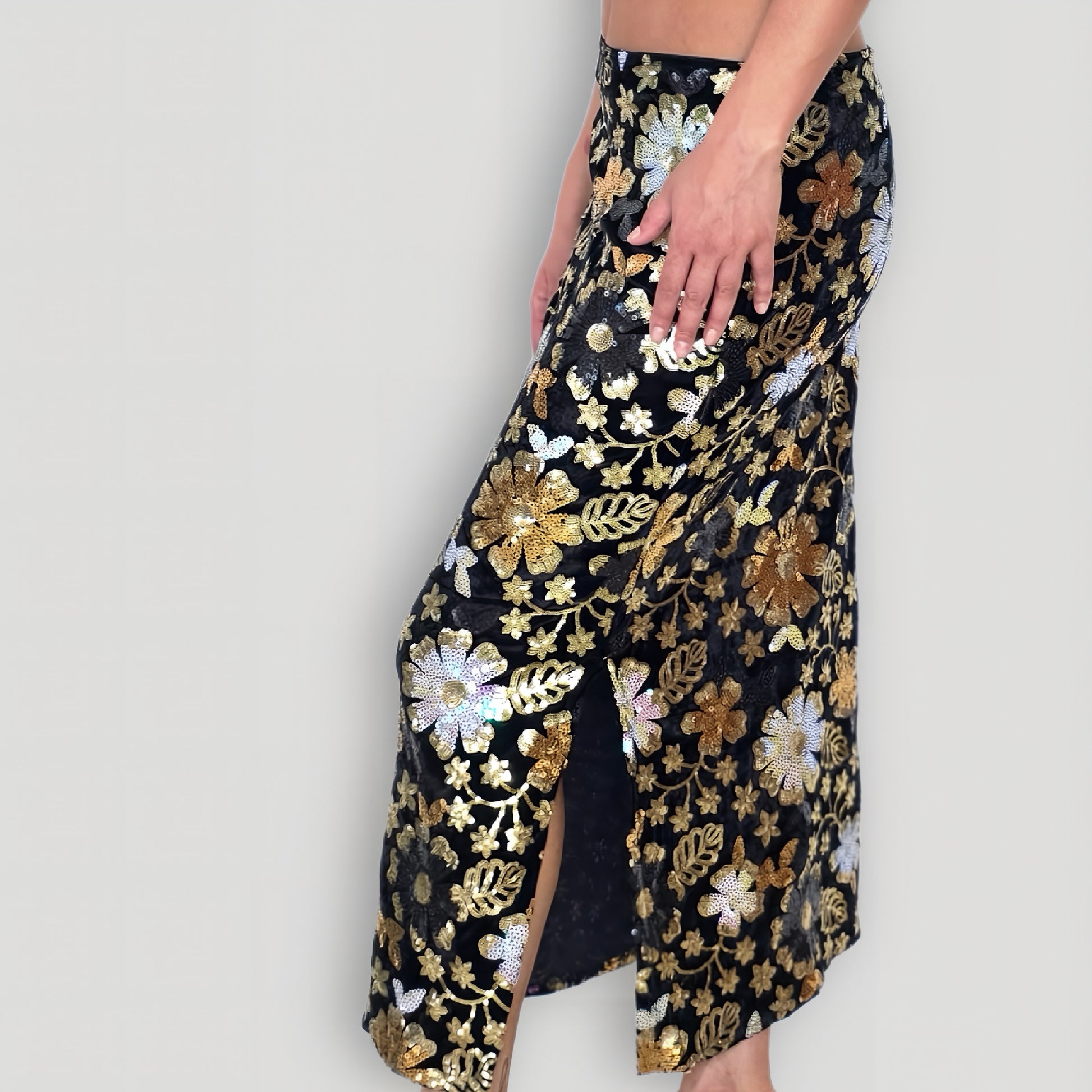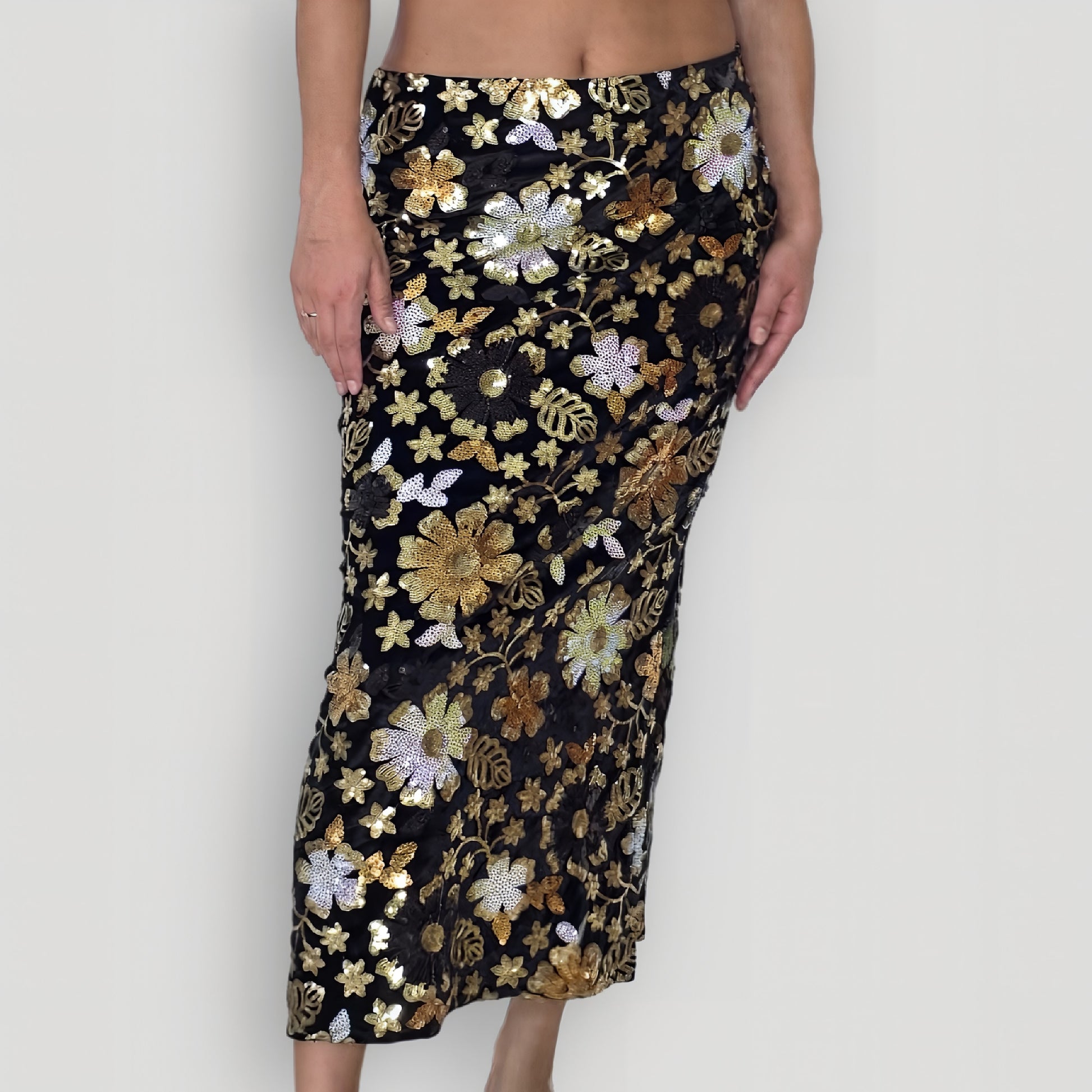חצאית מידי שחורה עם פאייטים פרחוניים – שילוב מושלם של אלגנטיות ונוכחות. בד אלסטי ונוח שמחבק את הגוף, עם דוגמת פרחים מטאלית מרהיבה בצבעי זהב, כסף וברונזה, המוסיפה ברק יוקרתי לכל הופעה. מתאימה לאירועים, לערבי חג או לכל הזדמנות שבה תרצי להרגיש זוהרת ומיוחדת.