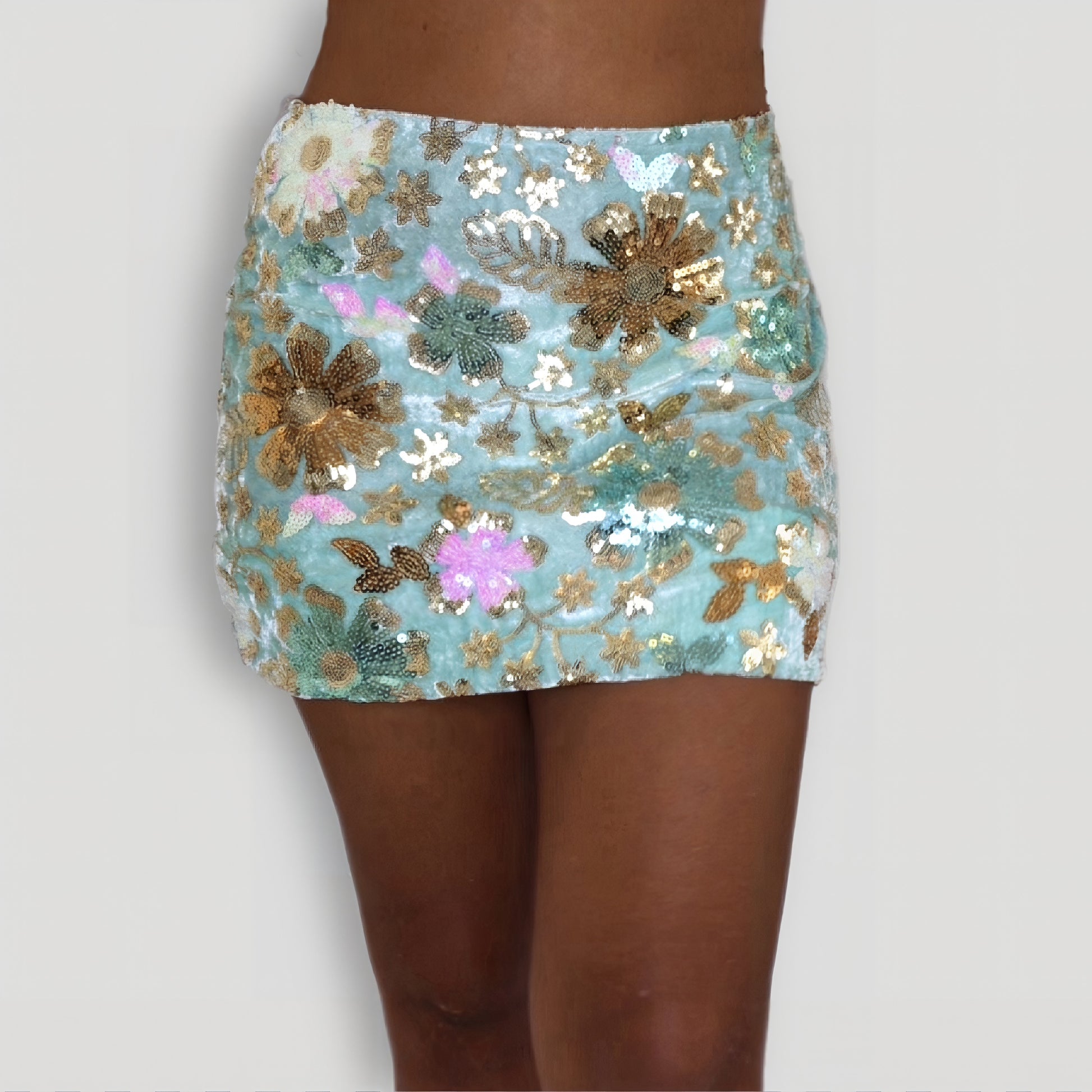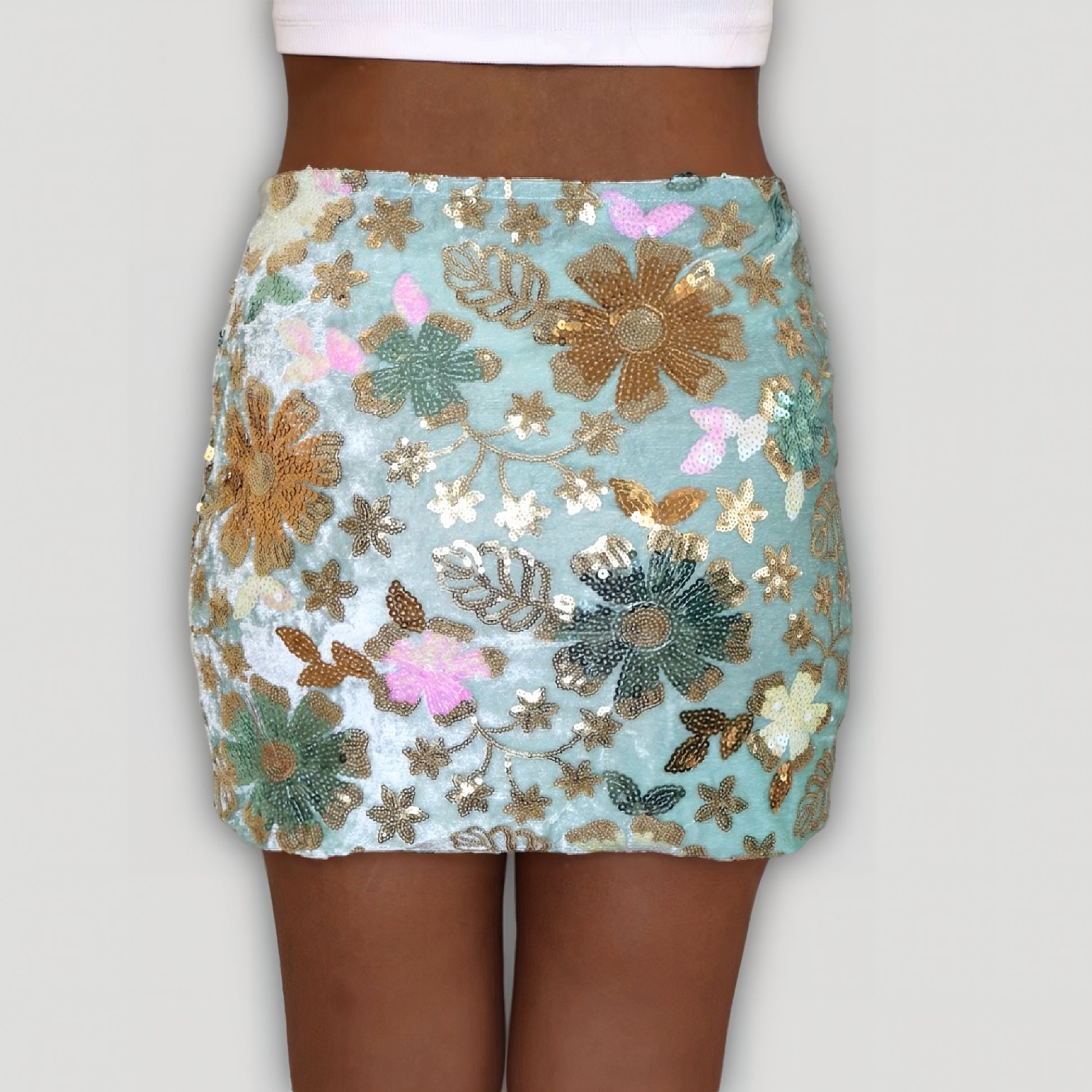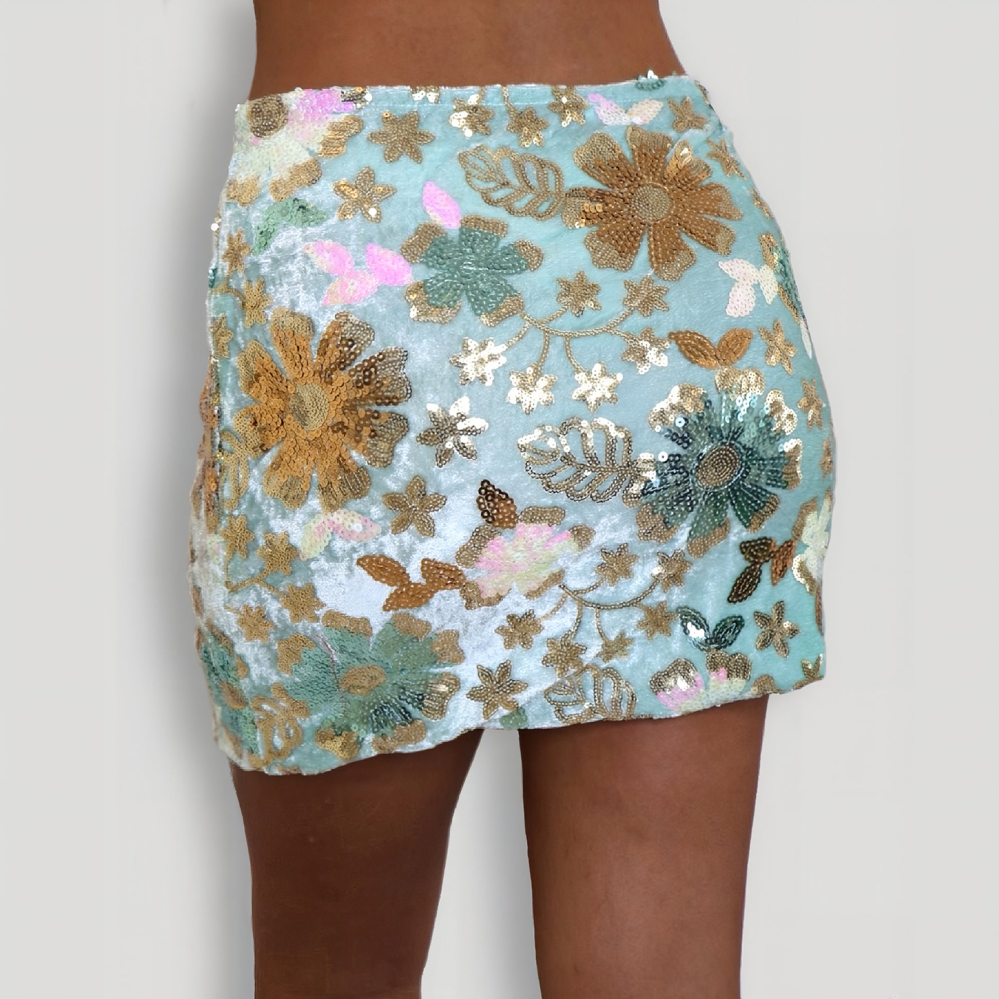 חצאית מיני ייחודית בגוון טורקיז רך, רקומה בעבודת יד עם פרחי פאייטים בזהב, ירוק, לבן וורוד. בד קטיפתי מבריק שמחמיא לגוף ויוצר מראה זוהר ונשי. מושלמת לאירוע ערב או הופעה שיקית בלתי נשכחת.