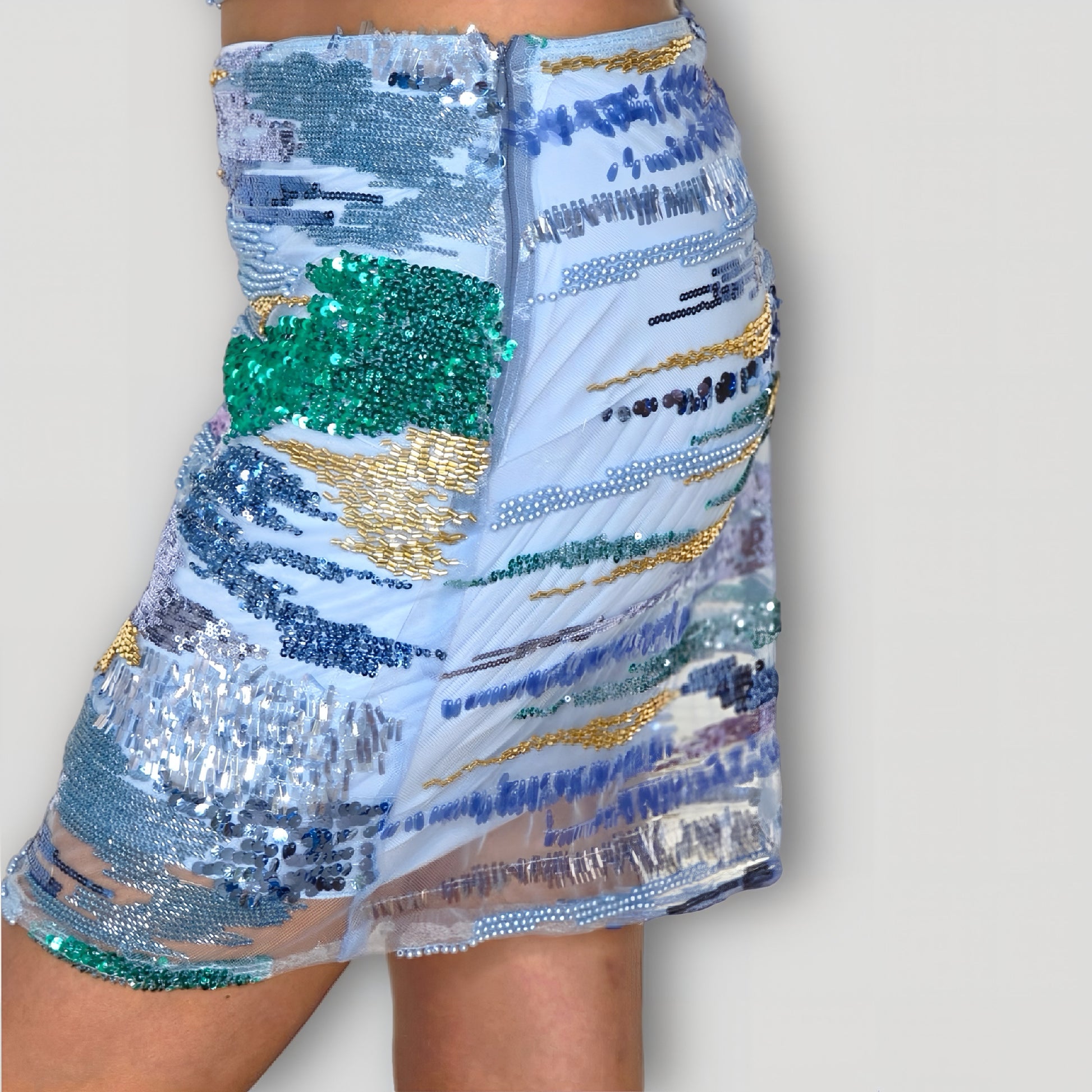 חצאית מיני ייחודית בגווני כחול שמיים, ירוק טורקיז, סגול וזהב, בעיטור פאייטים מרהיב היוצר מראה אמנותי ומלא תנועה. הגזרה הצמודה מחמיאה לגוף, והברק המשתנה של הפאייטים מעניק תחושת יוקרה וזוהר – מושלמת לאירועים חגיגיים, מסיבות ערב ולוק בלתי נשכח.