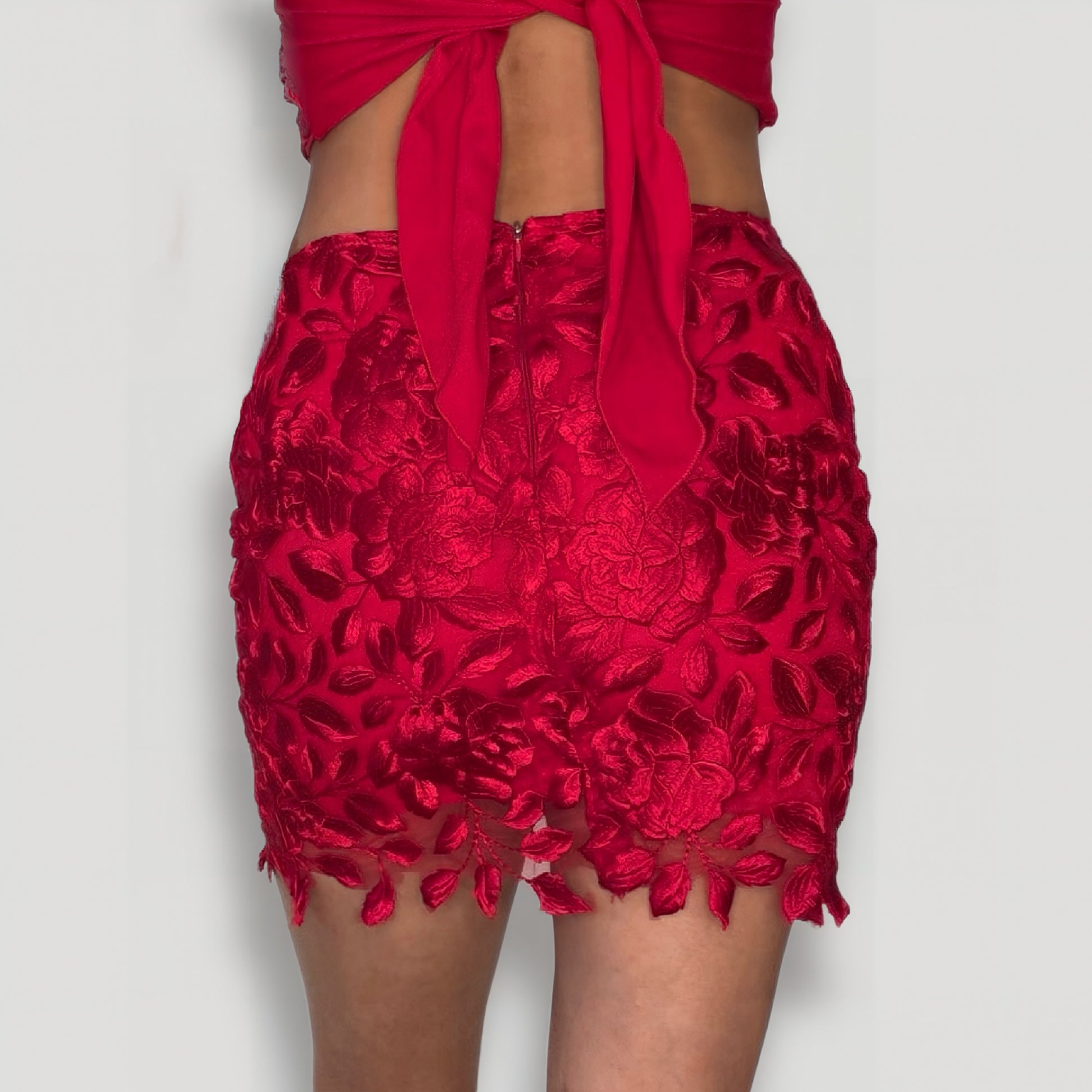 חצאית מיני אדומה עזה בתחרה פרחונית עשירה, בעלת קצוות גזורים בעבודת יד המוסיפים טאץ’ רומנטי ונשי. הגזרה הצמודה מדגישה את הגוף ומעניקה מראה חגיגי ונועז, מושלמת לאירועי ערב, חגיגות ולאאוטפיט יוקרתי בשילוב מחוך תואם.