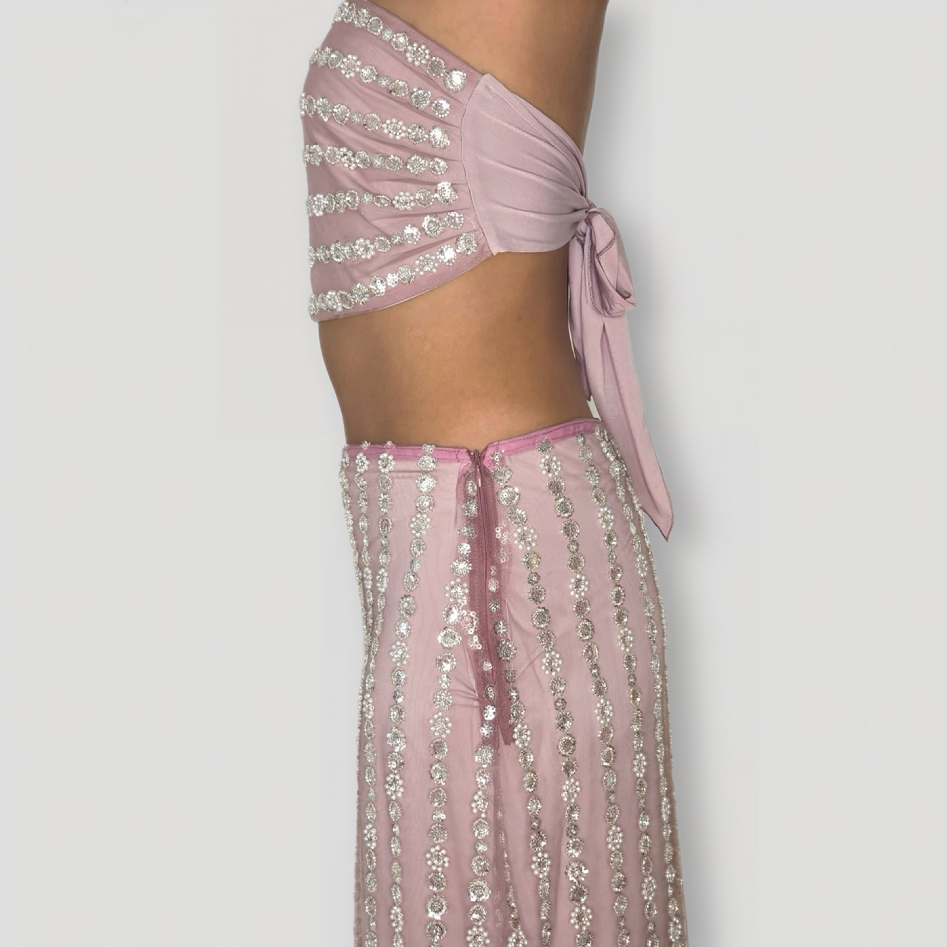 מחוך סטרפלס ורוד פסטלי בעל עיצוב רומנטי ועדין, מעוטר בפסי פאייטים אופקיים מנצנצים המוסיפים זוהר ייחודי ומראה חגיגי. הבד השקוף בשכבה העליונה מעניק תחושת קלילות תוך שמירה על קו מחמיא ומעוצב. מושלם כטופ נפרד או כחלק מסט תואם לחצאית לאירועים מיוחדים.