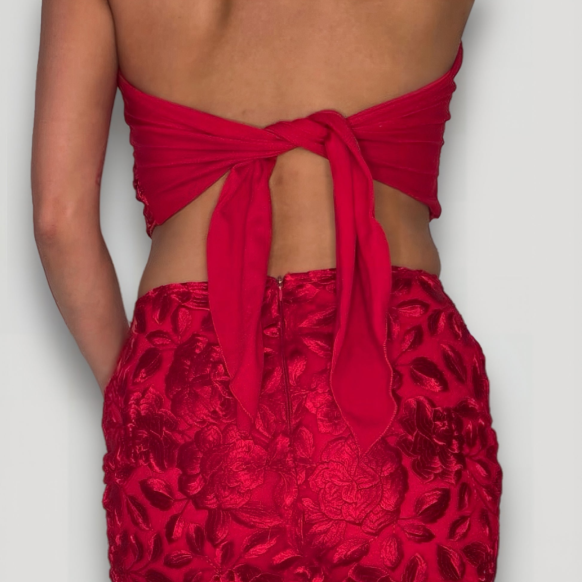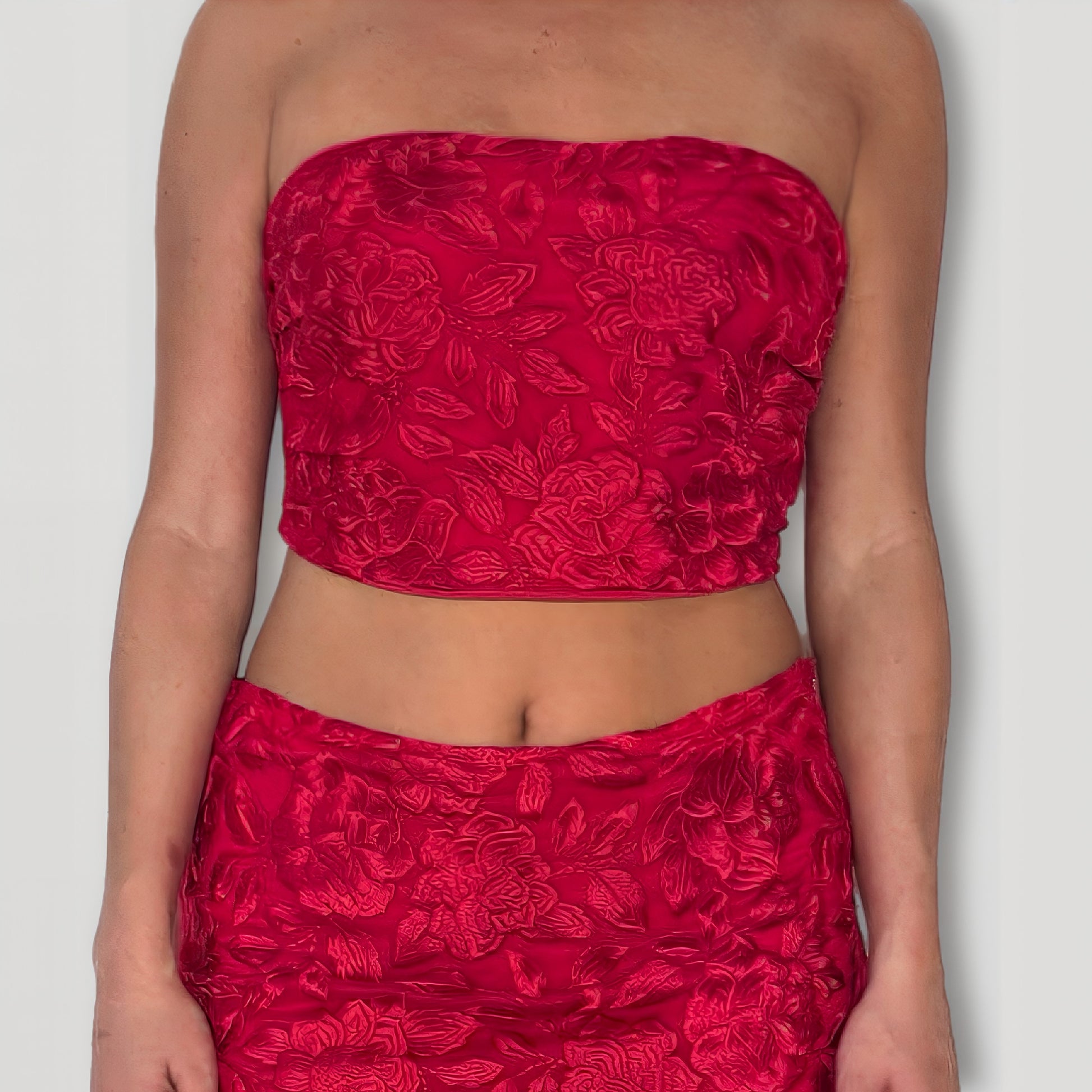 מחוך סטרפלס אדום עז בעבודת תחרה פרחונית עשירה, המשלבת שקיפות עדינה ואלמנטים נשיים מרהיבים. הגזרה המחמיאה יוצרת מראה רומנטי וחגיגי שמתאים גם כטופ עצמאי וגם כחלק מסט תואם עם החצאית לאירועים מיוחדים ולוקי ערב יוקרתיים.